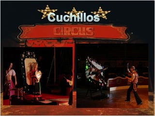 Un circo es un espectáculo que incluye acróbatas, payasos, magos y adiestradores de animales que se presentan dentro de una carpa circular. Los acróbatas demuestran equilibrio y coordinación, los payasos hacen bromas para entretener al público, los magos usan rituales para alteraciones físicas y los adiestradores enseñan trucos a los animales. El circo también incluye otras actividades como la tela acrobática, el malabarismo y el monociclo.