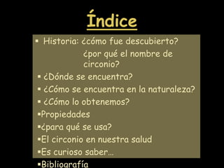 El circonio es un metal de transición que se encuentra ampliamente distribuido en la corteza terrestre. Fue descubierto en 1789 por Klaproth cuando analizó el mineral circón y encontró un nuevo elemento, el circonio. Se obtiene principalmente del mineral circón y se usa en aleaciones resistentes al calor y corrosión en reactores nucleares, turbinas de aviones y satélites.
