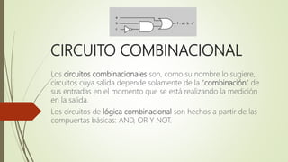 Los circuitos combinacionales son circuitos cuya salida depende únicamente de las combinaciones de sus entradas en el momento. Se construyen usando compuertas lógicas básicas como AND, OR y NOT. Para analizar un circuito combinacional, se escriben expresiones que mapean las salidas de cada compuerta, desde las entradas hasta la salida final, obteniendo su función lógica.