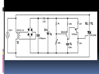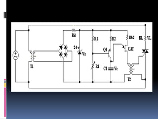 Este documento describe el circuito de disparo de un triac. Explica que el circuito incluye un transistor UJT y un transformador de pulsos que cargan un capacitor a través de una resistencia. Cuando el voltaje del capacitor alcanza un umbral, se activa el UJT y el capacitor se descarga a través de una resistencia más pequeña, generando un pulso de disparo para el triac. El triac permite controlar cargas de corriente alterna como motores y sistemas de calentamiento de manera bidireccional.