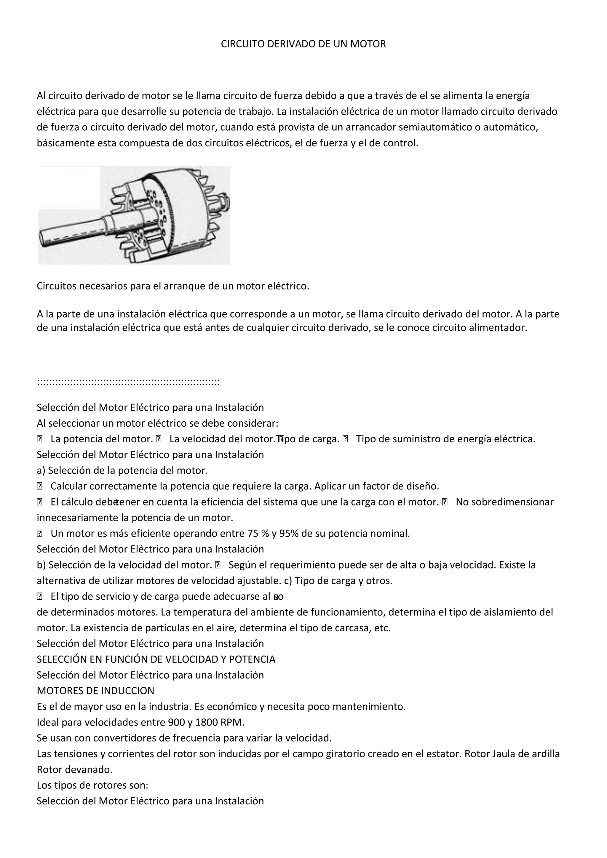 El documento describe los componentes principales de un circuito derivado de un motor eléctrico, incluyendo el circuito de fuerza y el circuito de control. Explica que el circuito derivado conduce la energía eléctrica al motor para que pueda desarrollar su potencia, y que cuando se usa un arrancador semiautomático o automático, el circuito derivado consta de un circuito de fuerza y uno de control. También proporciona detalles sobre el cálculo de la capacidad del conductor del circuito derivado y la selección de los