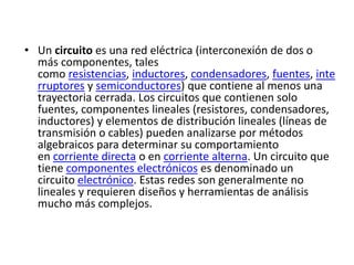 Un circuito eléctrico es una red interconectada de componentes como resistencias e inductores que contiene al menos una trayectoria cerrada para que fluya la corriente. Los circuitos se pueden analizar usando leyes como las de Kirchhoff y Ohm para determinar la corriente y tensión. Existen herramientas como SPICE que permiten simular circuitos de manera más compleja.