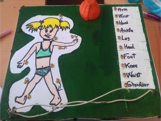 El documento describe un circuito eléctrico educativo creado por un grupo de estudiantes para aprender las partes del cuerpo humano en inglés. Detalla las tareas completadas por cada estudiante en la construcción del circuito y la iluminación de una bombilla al tocar las partes del cuerpo etiquetadas. También incluye los materiales utilizados y el costo total del proyecto.