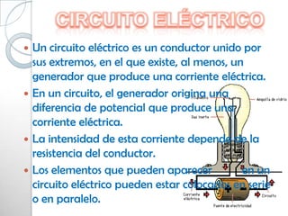 Un circuito eléctrico contiene al menos un generador que produce una corriente eléctrica a través de un conductor unido por sus extremos. La intensidad de esta corriente depende de la resistencia del conductor. Existen dos tipos de corrientes, continua y alterna, que difieren en si la corriente fluye en una sola dirección o cambia periódicamente de sentido.