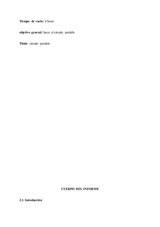 El documento describe un proyecto sobre la creación de un circuito eléctrico paralelo realizado por un equipo de estudiantes en el Liceo Departamental Santiago de Cali. Se explica la definición de un circuito eléctrico, sus componentes, y los tipos de circuitos, además de las implicaciones de un cortocircuito. También se enumeran los materiales y herramientas utilizados en la construcción del circuito.