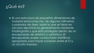 Un circuito integrado es una estructura de pequeñas dimensiones fabricada en material semiconductor sobre la que se construyen circuitos electrónicos mediante fotolitografía. Existen circuitos integrados monolíticos, híbridos de capa fina y híbridos de capa gruesa. Los circuitos integrados se clasifican por su nivel de integración en SSI, MSI, LSI, VLSI, ULSI y GLSI dependiendo del número de transistores. También se clasifican en analógicos o digitales dependiendo de si realizan funciones continu