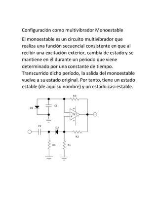 El circuito integrado 555 puede configurarse como multivibrador astable, que alterna entre dos estados 'cuasi-estables' y se utiliza para generar ondas periódicas y trenes de pulsos. También puede funcionar como multivibrador monoestable, donde cambia de estado por un período determinado tras recibir una excitación, regresando luego a su estado original. Ambas configuraciones son útiles en diversas aplicaciones electrónicas.