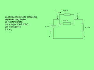 El circuito mixto tiene una resistencia total de 20 ohmios. La intensidad total en el circuito es de 4 amperios y se divide en 0.8 amperios a través de R1 y 3.2 amperios a través de R2. Los voltajes son de 32 voltios entre A y B, y 48 voltios entre B y C, sumando a los 80 voltios totales aplicados.