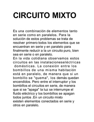 Este documento describe los circuitos mixtos, que contienen tanto elementos en serie como en paralelo. Explica que para resolver problemas de circuitos mixtos, primero se deben resolver los elementos en serie y en paralelo de forma independiente, para luego reducir el circuito a uno puro en serie o paralelo. También da ejemplos de circuitos mixtos comunes en instalaciones eléctricas domésticas.