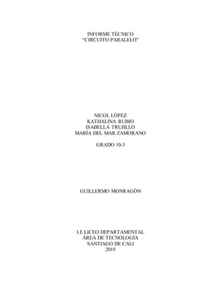 Este informe técnico describe los componentes básicos de un circuito eléctrico, incluyendo generadores, conductores, receptores, elementos de maniobra y protección. Explica los tipos de circuitos (serie, paralelo y mixto), sus diferencias y cortocircuitos. También detalla los pasos para construir un circuito eléctrico básico y concluye resumiendo las principales normas de seguridad industrial.