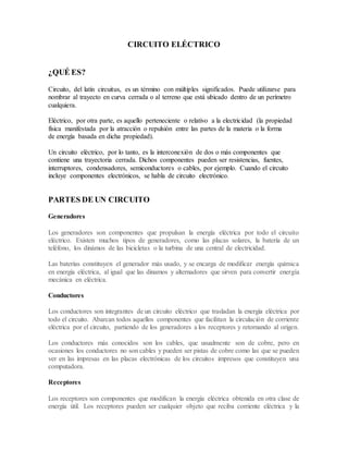 Este documento presenta un informe técnico sobre circuitos eléctricos paralelos realizado por estudiantes de grado 10. Explica conceptos básicos como qué es un circuito eléctrico, sus partes principales como generadores, conductores, receptores y elementos de maniobra y protección. Luego describe los tipos de circuitos eléctricos, haciendo énfasis en la diferencia entre circuitos en serie, paralelo y mixto. Finalmente, presenta las herramientas y pasos para construir un circuito paralelo, así como algun