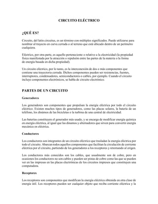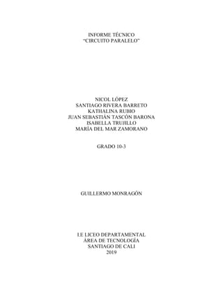 Este informe técnico describe los conceptos básicos de un circuito eléctrico paralelo, incluyendo sus partes (generadores, conductores, receptores, elementos de maniobra y protección), tipos de circuitos (serie, paralelo y mixto), cortocircuitos, diferencias entre circuitos en serie y paralelo, herramientas y pasos para construir un circuito paralelo, y normas de seguridad industrial.