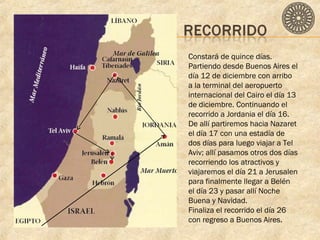 Este documento describe un viaje de 15 días a Tierra Santa que comienza el 12 de diciembre en Buenos Aires y finaliza el 26 de diciembre. Incluye visitas a Egipto, Jordania, Nazaret, Tel Aviv, Jerusalén y Belén. Se detalla el itinerario día a día con los lugares a visitar y alojamientos en cada ciudad, incluyendo sitios religiosos y históricos como las pirámides de Giza, Petra, el Mar Muerto, el Muro de los Lamentos y la Basílica de la Natividad.