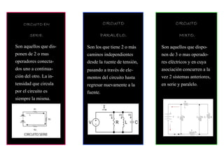 Un circuito eléctrico es un recorrido cerrado que transporta energía eléctrica de un elemento productor a uno consumidor. Existen tres tipos de circuitos: circuitos en serie donde los elementos están conectados uno a continuación del otro y la corriente es la misma en todo el circuito, circuitos paralelos que tienen múltiples caminos independientes desde la fuente de tensión, y circuitos mixtos que combinan elementos en serie y paralelo.
