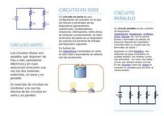 Un circuito es una interconexión de componentes eléctricos que transporta corriente eléctrica a través de por lo menos una trayectoria cerrada. Hay tres tipos de circuitos: serie, paralelo y mixto. Un circuito mixto combina circuitos en serie y en paralelo al mismo tiempo.