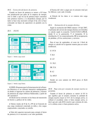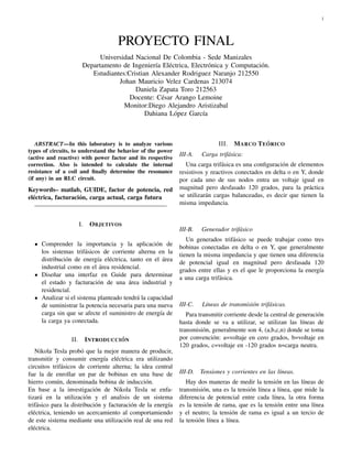 Este proyecto analiza circuitos trifásicos y facturación de energía eléctrica. Se diseña una interfaz para determinar el estado y facturación de áreas industriales y residenciales. Se analiza si el sistema puede suministrar potencia para una nueva carga sin afectar la carga existente. Se resuelven circuitos actuales y futuros usando el método del equivalente monofásico y se calculan corrientes, potencias, factores de potencia y capacitores de corrección.