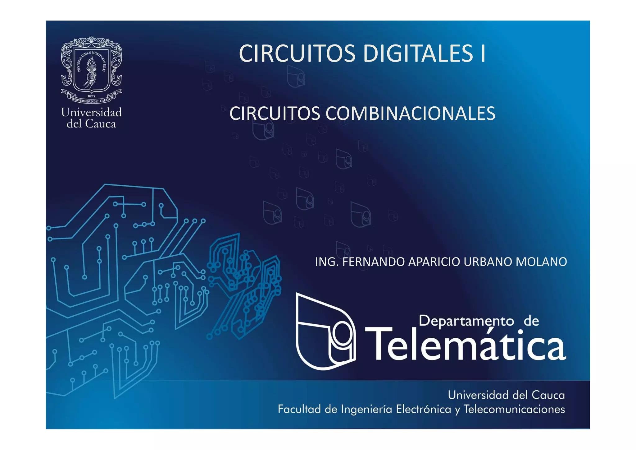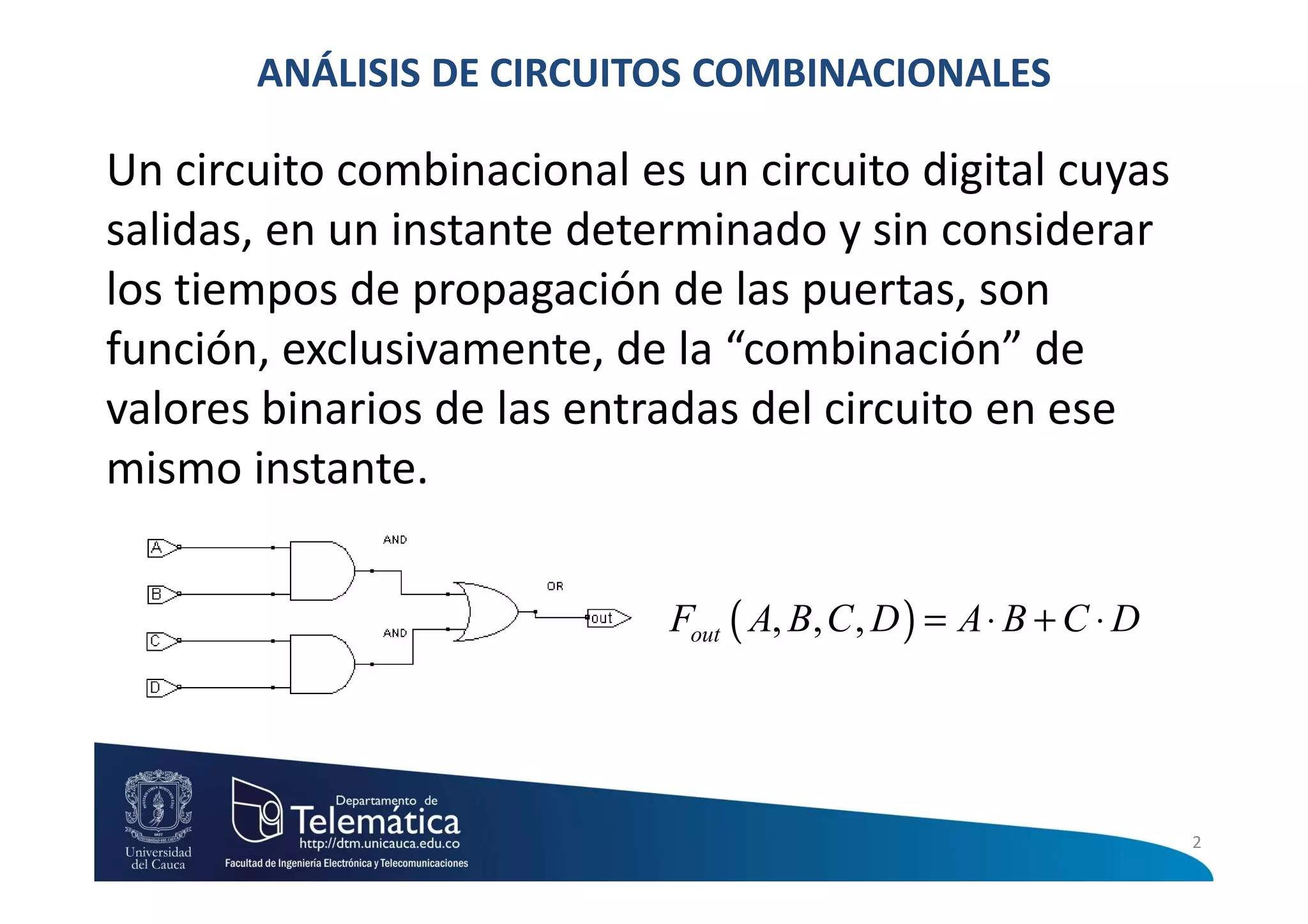 Este documento presenta información sobre circuitos digitales combinacionales. Explica que un circuito combinacional es aquel cuyas salidas en un instante son función exclusivamente de las entradas en ese mismo instante. También define conceptos como máximos términos, mínimos términos, sumas de productos y productos de sumas para representar funciones lógicas. Finalmente, describe el procedimiento para diseñar circuitos lógicos combinacionales que incluye elaborar la tabla de verdad, aplicar sumas de productos o productos de sumas y simplificar la