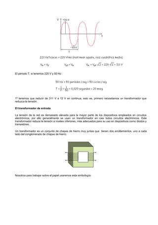 1) Los circuitos rectificadores convierten la corriente alterna en continua usando diodos. Los tres circuitos básicos son el rectificador de media onda, de onda completa con 2 diodos y puente de diodos.