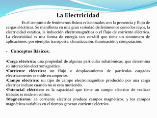 Este documento resume conceptos básicos de electricidad e introduce los tipos de circuitos eléctricos. Explica que la electricidad es un flujo de cargas eléctricas y se manifiesta en fenómenos como la corriente eléctrica. Describe los componentes básicos de un circuito eléctrico como resistencias, fuentes y conductores. Además, define circuitos en serie y paralelo y diferentes tipos de fuentes como baterías y fuentes dependientes.