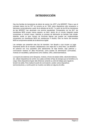 El documento describe el transistor MOSFET. Explica que los MOSFET tienen tres regiones de operación: la región de corte cuando no hay corriente, la región óhmica cuando actúa como una resistencia variable, y la región de saturación cuando mantiene una corriente constante independientemente de la tensión. También resume las ventajas de los MOSFET como su pequeño tamaño, proceso de fabricación simple, y su popularidad en aplicaciones electrónicas digitales y de potencia.