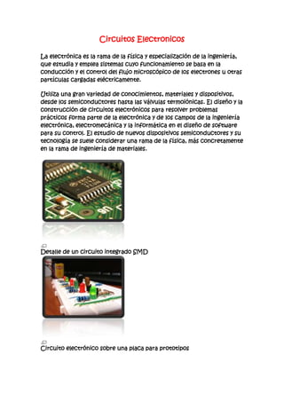 La electrónica estudia y emplea sistemas cuyo funcionamiento se basa en el flujo de electrones. Comenzó con el diodo de vacío en 1904 y tuvo un gran avance con el transistor en 1948 que permitió la miniaturización. Actualmente se divide en electrónica analógica y digital, y es una de las ramas de ingeniería con mayor proyección al futuro junto con la informática.