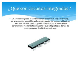 Este documento describe los conceptos básicos de los circuitos integrados. Explica que un circuito integrado es un pequeño chip de semiconductor que contiene circuitos electrónicos fabricados mediante fotolitografía. Luego describe algunos procesos clave en la fabricación de circuitos integrados como la preparación de la oblea de silicio, oxidación, difusión, implantación iónica, metalización y empacado. Finalmente, clasifica los circuitos integrados en función de la cantidad de componentes que contienen.