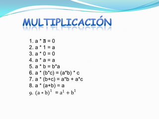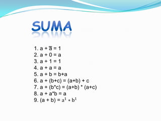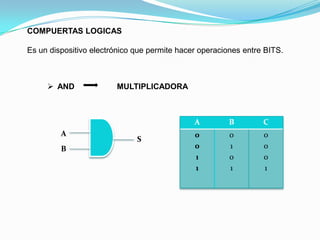 Este documento describe tres operaciones lógicas básicas entre bits: AND (multiplicadora), OR (sumadora) y NOT (negadora). Proporciona tablas de verdad para cada operación y un ejemplo de cómo se pueden combinar usando una compuerta lógica xy para calcular z.