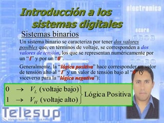 Este documento presenta una introducción a los sistemas digitales binarios y lógica combinacional. Explica que los sistemas digitales usan dos valores posibles representados numéricamente como "1" y "0". También describe los componentes lógicos básicos como puertas AND, OR y NOT, y cómo se pueden usar para representar funciones lógicas mediante tablas de verdad y expresiones booleanas.