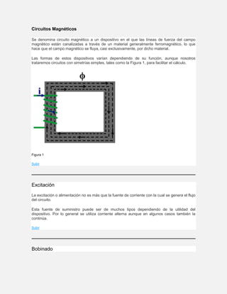 Este documento describe los conceptos básicos de los circuitos magnéticos. Explica que un circuito magnético canaliza las líneas de fuerza magnética a través de un material ferromagnético. Describe los componentes clave como el núcleo, bobinado, entrehierro y excitación. También establece analogías entre circuitos magnéticos y eléctricos.