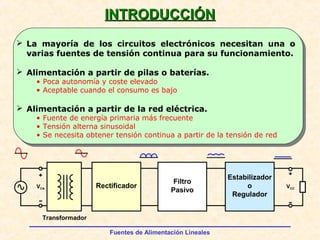 Este documento describe los componentes básicos de una fuente de alimentación lineal, incluyendo transformadores, rectificadores, filtros y estabilizadores/reguladores. Explica cómo cada componente convierte la tensión de entrada en una tensión continua para alimentar cargas electrónicas, y los factores a considerar en el diseño de cada parte de la fuente de alimentación.