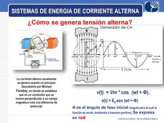 Este documento presenta información sobre circuitos eléctricos de corriente alterna. Explica cómo se genera la tensión alterna usando el principio descubierto por Faraday. Luego describe conceptos clave como frecuencia, amplitud, período, ondas en fase y desfasadas. También analiza circuitos resistivos puros, capacitivos puros e inductivos puros, y explica la relación entre voltaje y corriente en cada uno. Por último, cubre circuitos RLC en serie y resonancia.