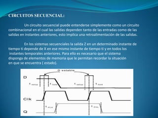 Este documento trata sobre circuitos secuenciales. Explica que estos circuitos pueden almacenar información en elementos de memoria y que sus salidas dependen tanto de las entradas actuales como de los estados anteriores debido a la retroalimentación. Describe que los circuitos secuenciales se definen por funciones de transición que indican cómo el estado y la salida cambian en función de las entradas y el estado actual. Finalmente, presenta algunos tipos comunes de flip-flops como los S-R, D y J-K y sus aplicaciones.