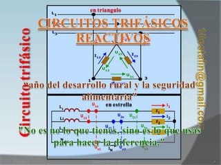 El documento describe circuitos trifásicos reactivos. Incluye diagramas de circuitos trifásicos con cargas inductivas y fórmulas para calcular la potencia activa, reactiva y aparente. También cubre el cálculo de capacitores para compensar la potencia reactiva, incluyendo sus valores y cómo conectarlos en estrella o triángulo.