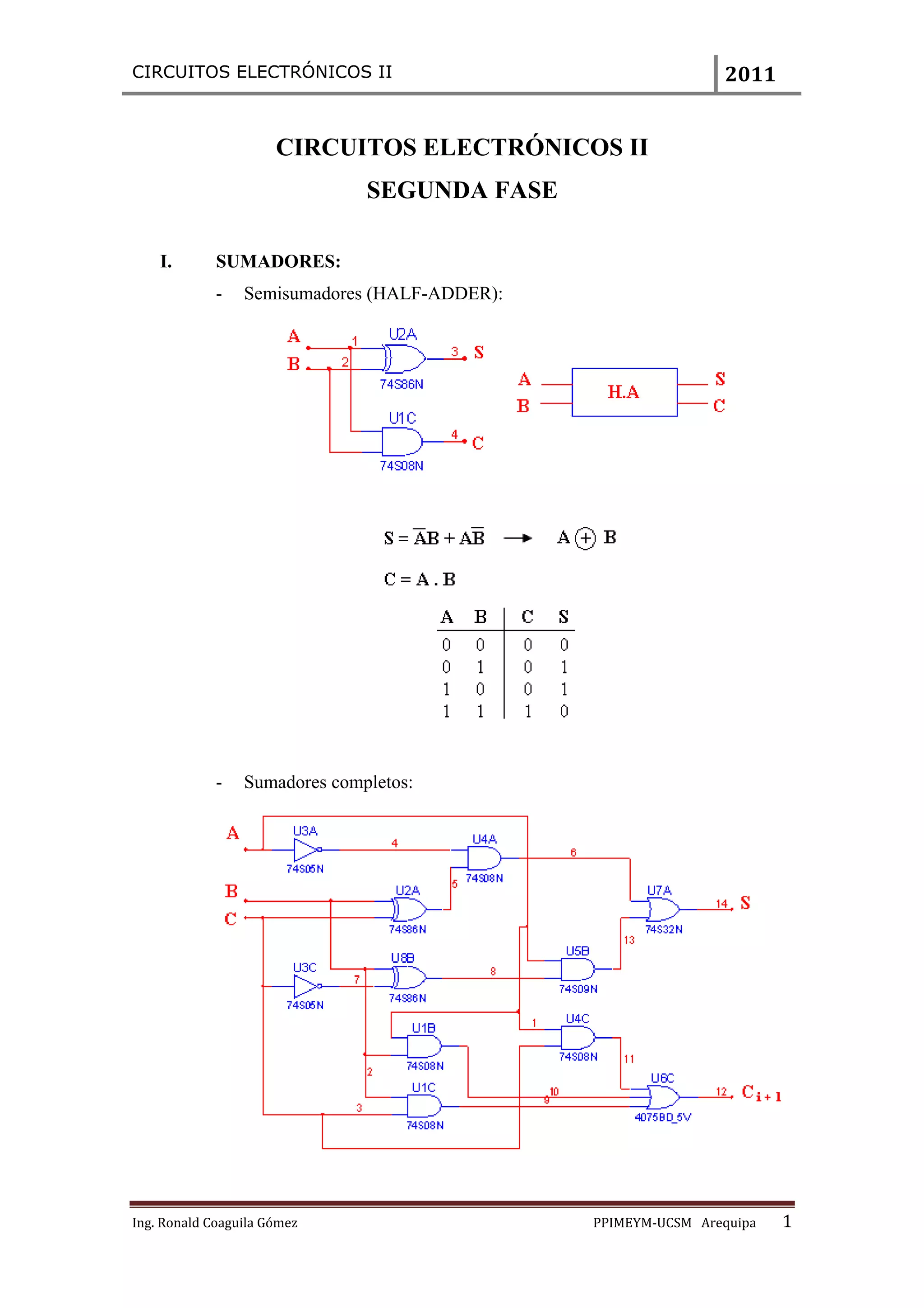 El documento cubre los siguientes temas de circuitos electrónicos: 1) sumadores y comparadores, 2) codificadores y decodificadores para displays de 7 segmentos, 3) multiplexores y demultiplexores utilizando circuitos TTL como el 74150 y 4051, y 4) códigos correctores de error como el código de Hamming para detección y corrección de errores.
