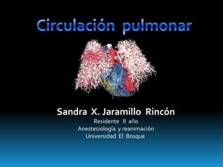 Este documento resume los conceptos clave de la circulación pulmonar, incluyendo que el flujo sanguíneo pulmonar depende de la resistencia vascular periférica, la gravedad, la presión alveolar y el gradiente de presión arterial-venosa. También explica los mecanismos de control pulmonar como la vasoconstricción hipoxica y la optimización de la ventilación-perfusión, así como los efectos de diferentes medicamentos en la circulación pulmonar.