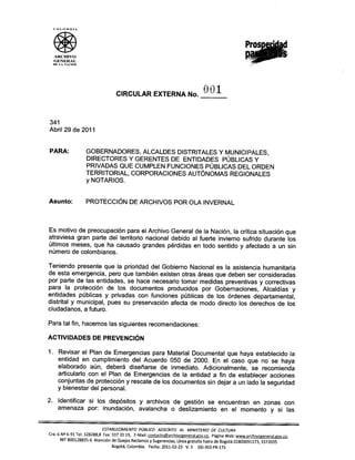 El documento provee recomendaciones para la protección de archivos durante la ola invernal en Colombia, incluyendo actividades de prevención como revisar planes de emergencias, identificar riesgos de inundación, y actualizar inventarios; actividades para la atención de desastres como retirar documentos secos y secar documentos mojados; y actividades posteriores como reportar daños y solicitar asistencia de conservación.