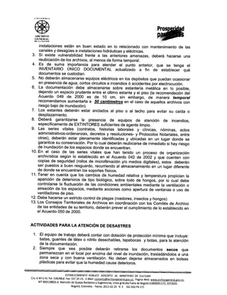 El documento provee recomendaciones para la protección de archivos durante la ola invernal en Colombia, incluyendo actividades de prevención como revisar planes de emergencias, identificar riesgos de inundación, y actualizar inventarios; actividades para la atención de desastres como retirar documentos secos y secar documentos mojados; y actividades posteriores como reportar daños y solicitar asistencia de conservación.