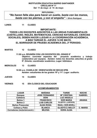 Este documento es una circular de una institución educativa que contiene información sobre las actividades de la semana del 11 al 15 de mayo. Indica que todos los docentes de áreas fundamentales deben enviar el borrador de la prueba académica del segundo periodo antes del jueves 14 de mayo. También detalla una reunión con los docentes del grado 9o el martes 12 y una charla de orientación sobre becas EPM para estudiantes de 10o y 11o el miércoles 13.
