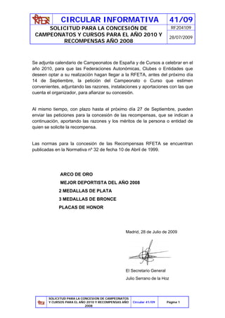 La circular informa sobre la solicitud para la concesión de campeonatos y cursos para el año 2010 en España, así como recompensas para el año 2008. Se adjunta un calendario de eventos propuestos y se pide a las federaciones regionales que soliciten la organización de dichos eventos antes del 14 de septiembre, proporcionando detalles sobre las instalaciones. También se pide que soliciten recompensas para personas o entidades antes del 27 de septiembre.