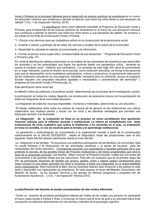 El documento destaca la importancia de que los docentes asuman un rol de autoridad emancipatoria al conceptualizar críticamente su práctica pedagógica. También enfatiza la necesidad de planificar de manera integral e inclusiva para garantizar aprendizajes de calidad para todos los estudiantes, orientada por los fines de la educación y evaluando los avances logrados. Finalmente, propone que la planificación se base en la investigación-acción, la participación colectiva y la integración de la evaluación para mejorar continuamente las prácticas educativas