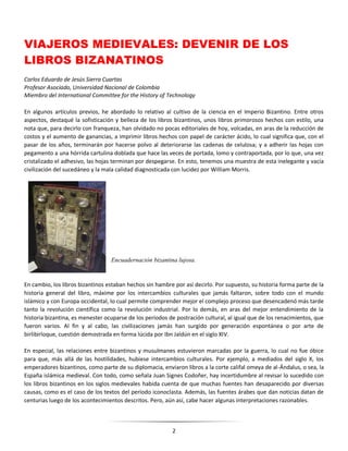 El documento resume la historia de los libros bizantinos y su intercambio cultural con el mundo islámico y Europa occidental durante la Edad Media. Los libros bizantinos estaban bien hechos y eran obras de arte, mientras que los emperadores a veces enviaban libros a gobernantes musulmanes y europeos como parte de la diplomacia. Los árabes también adquirieron libros griegos a través del saqueo y la traducción en Bagdad, preservando así el conocimiento antiguo.