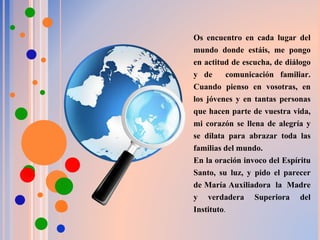 Este documento resume las reflexiones de la Madre General sobre el Capítulo General XXIII de las Hijas de María Auxiliadora. En particular, enfatiza la importancia del encuentro con Jesús y cómo este encuentro puede transformar vidas y comunidades. Insta a las hermanas a dejarse transformar por el encuentro con Jesús para poder testimoniar el amor de Dios a través de comunidades humanas y fraternas.