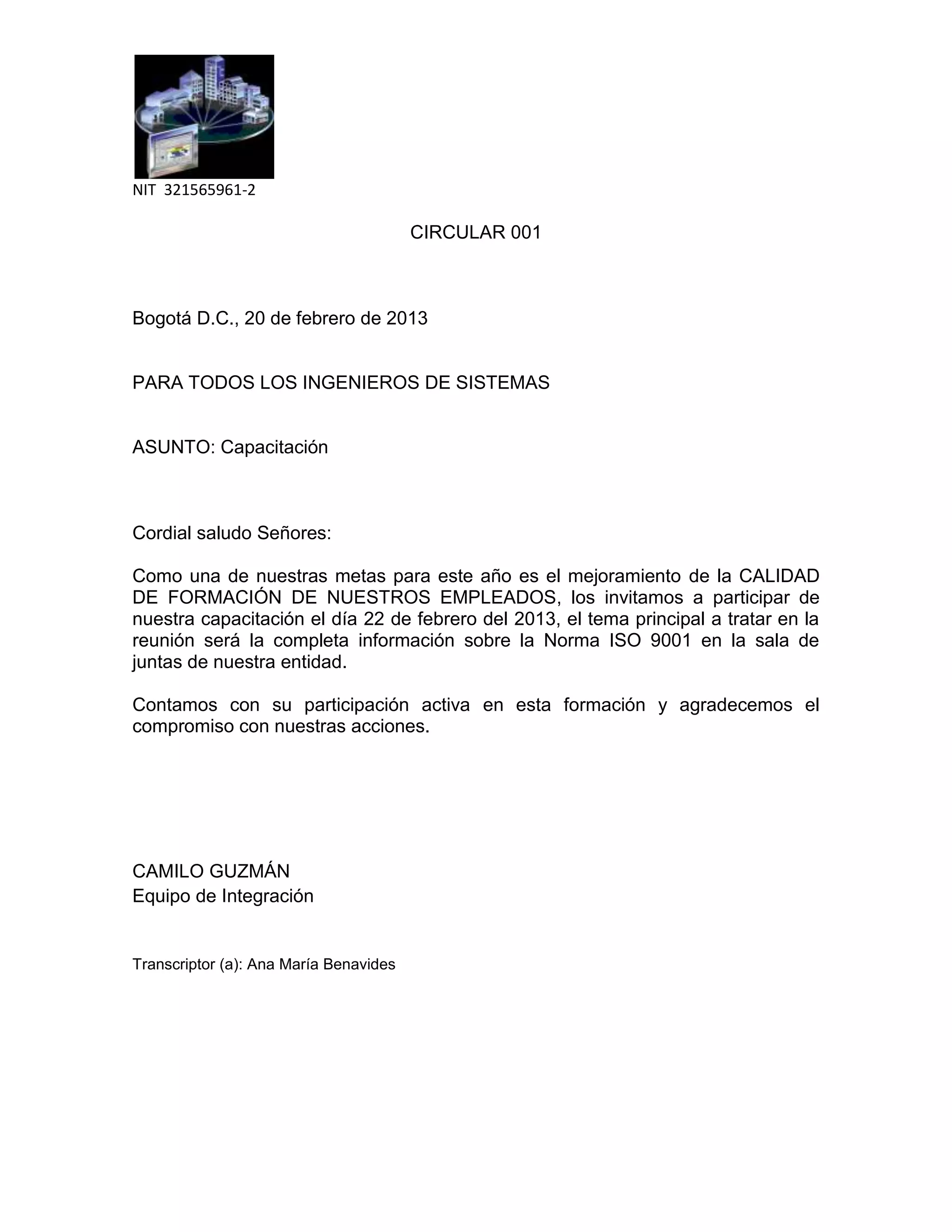 La circular invita a todos los ingenieros de sistemas a participar en una capacitación el 22 de febrero de 2013 sobre la Norma ISO 9001 con el objetivo de mejorar la calidad de formación de los empleados como parte de las metas del año, y se llevará a cabo en la sala de juntas de la entidad.
