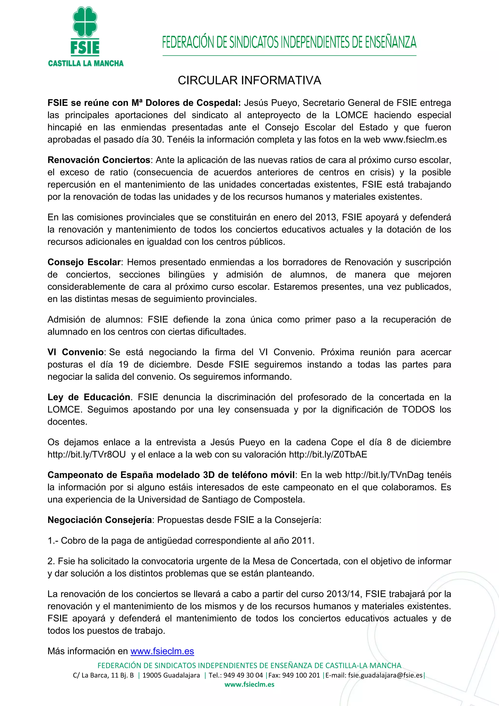El sindicato FSIE se reunió con la presidenta de Castilla-La Mancha para presentar sus propuestas sobre la LOMCE y defender la renovación de los conciertos educativos y recursos existentes. FSIE también presentó enmiendas al Consejo Escolar del Estado para mejorar los borradores sobre renovación de conciertos, secciones bilingües y admisión de alumnos. El sindicato sigue negociando el VI Convenio Colectivo y pidiendo a la Consejería el pago de la paga de antigüedad de 2011 y la