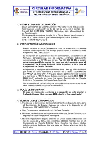 Este documento proporciona información sobre el XIV Campeonato de España Estándar y el XIV Campeonato de España de Arco Estándar Serie Española, que se celebrarán del 22 al 23 de mayo en Barcelona. Incluye detalles sobre la fecha, ubicación, participantes, inscripciones, normas, horarios y alojamientos disponibles.