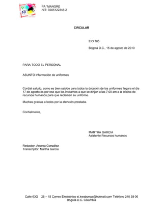 La circular informa al personal que la dotación de los nuevos uniformes se entregará el 17 de agosto a las 7:00 am en la oficina de recursos humanos. Una segunda circular recuerda a Martha García, asistente de recursos humanos, que la entrega de uniformes será el 17 de agosto y pide que se realice de manera ordenada.