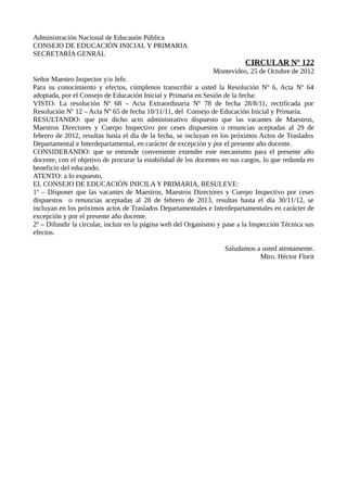 El Consejo de Educación Inicial y Primaria extiende una medida para incluir las vacantes de maestros, directores y el cuerpo inspectivo por ceses o renuncias hasta el 28 de febrero de 2013 en los próximos actos de traslados departamentales e interdepartamentales, con el objetivo de proveer estabilidad a los docentes y beneficiar a los estudiantes. La circular instruye a los maestros inspectores y jefes a difundir esta medida.