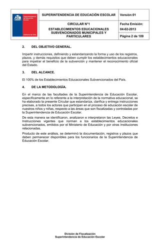 La circular establece instrucciones para los establecimientos educacionales subvencionados sobre los requisitos, registros y plazos que deben cumplir para mantener el reconocimiento oficial y recibir la subvención estatal. Señala que los establecimientos deben mantener documentos y registros disponibles para su revisión por 5 años y cumplir con la normativa educacional vigente. El objetivo es estandarizar los procesos de fiscalización de calidad de la educación.