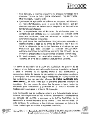 El documento convoca a una Junta Nacional de sindicatos de maestros para evaluar el cumplimiento de los acuerdos con el gobierno. Se enumeran varios puntos acordados, como decretos sobre traslados de maestros amenazados y riesgos laborales, pagos atrasados, y la creación de un estatuto docente unificado. La junta analizará el progreso de estos puntos y declarará el inicio de una huelga nacional de maestros si el gobierno no cumple con los acuerdos.