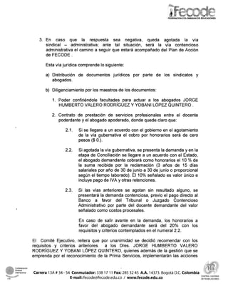 El documento proporciona instrucciones sobre el procedimiento que los sindicatos filiales de FECODE deben seguir para solicitar el reconocimiento, liquidación y pago de la prima de servicios para los docentes. Indica que FECODE elevará una petición al presidente y ministros para exigir el pago. Los sindicatos filiales deben presentar una solicitud a nombre de sus afiliados agotando la vía sindical-administrativa. Si es negada, se usará la vía contencioso-administrativa representados por dos abogados específicos.
